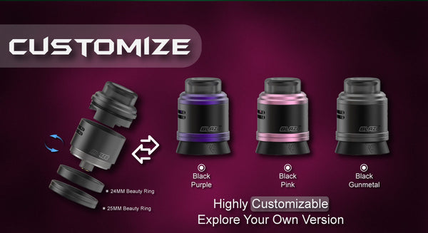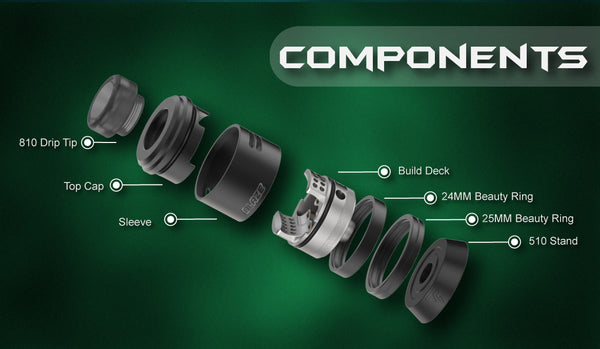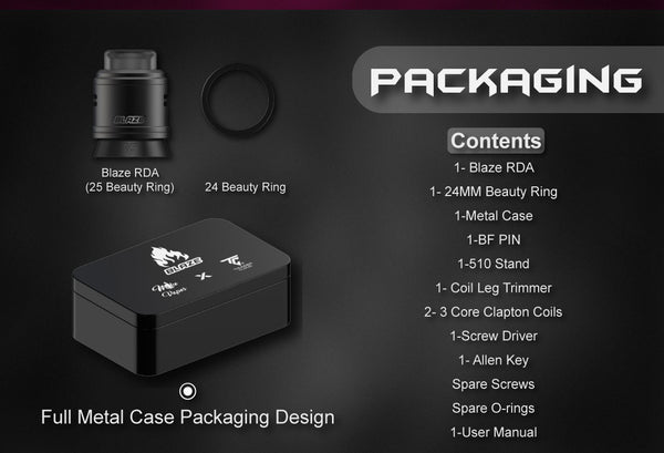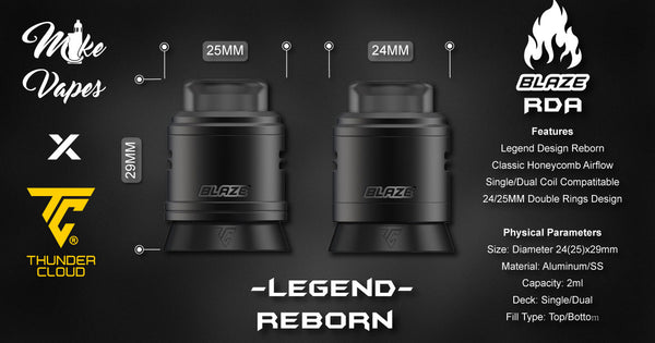 Thunder Cloud Blaze Dual RDA is designed by Mike Vapes and is engraved with the name of the model, supplied with a single coil & dual coils postless build deck with a “Victor” curve. The air inlets on the side are angled downwards and feature a surrounding airflow design, the top cap is easier to rotate at the side to adjust the airflow, and there are also 20pcs honeycomb air holes around to produce fantastic dense vapor. The finish is understated and discreet, Blaze rda holds up to 2ml e-juice and can be refilled via dripping and squonk mod. Accessing its 4-grab screws and postless build deck, it is not difficult by using a screwdriver to build your coil.