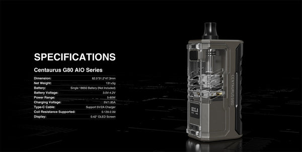 the Lost Vape Centaurus G80 AIO Pod Mod Kit, which features a 5-80W output range, a durable zinc and aluminum chassis, and a 5ml capacity in the Centaurus Boro Tank....