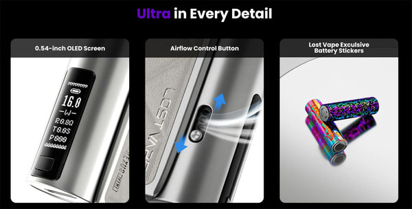 An integrated 0.54-inch OLED screen displays key vaping data — battery level, output wattage, coil resistance, puff count, and vaping duration — giving you real-time insight into usage. With 3-level adjustable airflow, you can customize the draw to be tighter or more airy based on your preference. The kit uses a single-button interface for power adjustment and on/off control, providing simplicity and ease of use for both beginners and experienced vapers.
