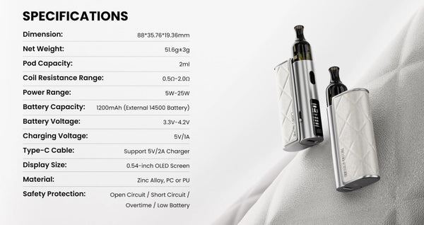 Display: 0.54" OLED screen (shows battery, wattage, coil resistance, puff count, vape time)