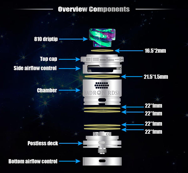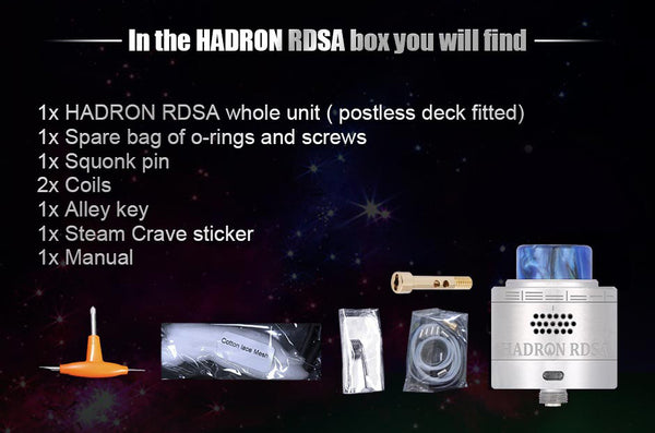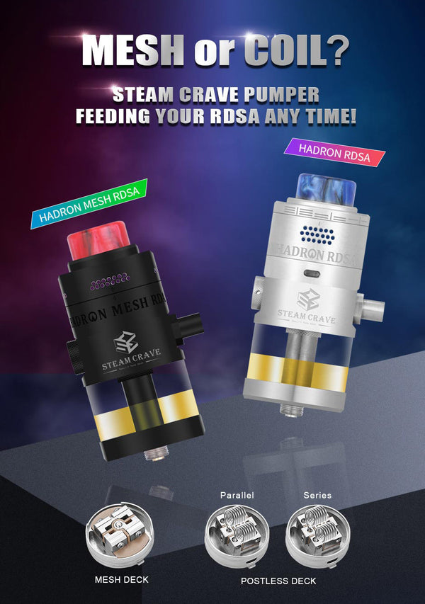 Hadron RDSA is designed with innovative and simple postless deck for both parallel and series builds. You can build 3.0mm to 5.0mm ID coils. It features side and bottom adjustable airflow. Hadron RDSA also supports medium to high wattage vaping. In addition, you can squonk juice to 12ml consistently and accurately with Steam Crave Pump (sold separately).